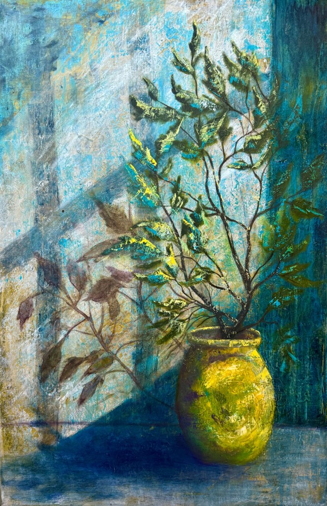 It blends the tactile qualities of acrylic mediums, the richness of oil paint, and the occasional use of layered collage.